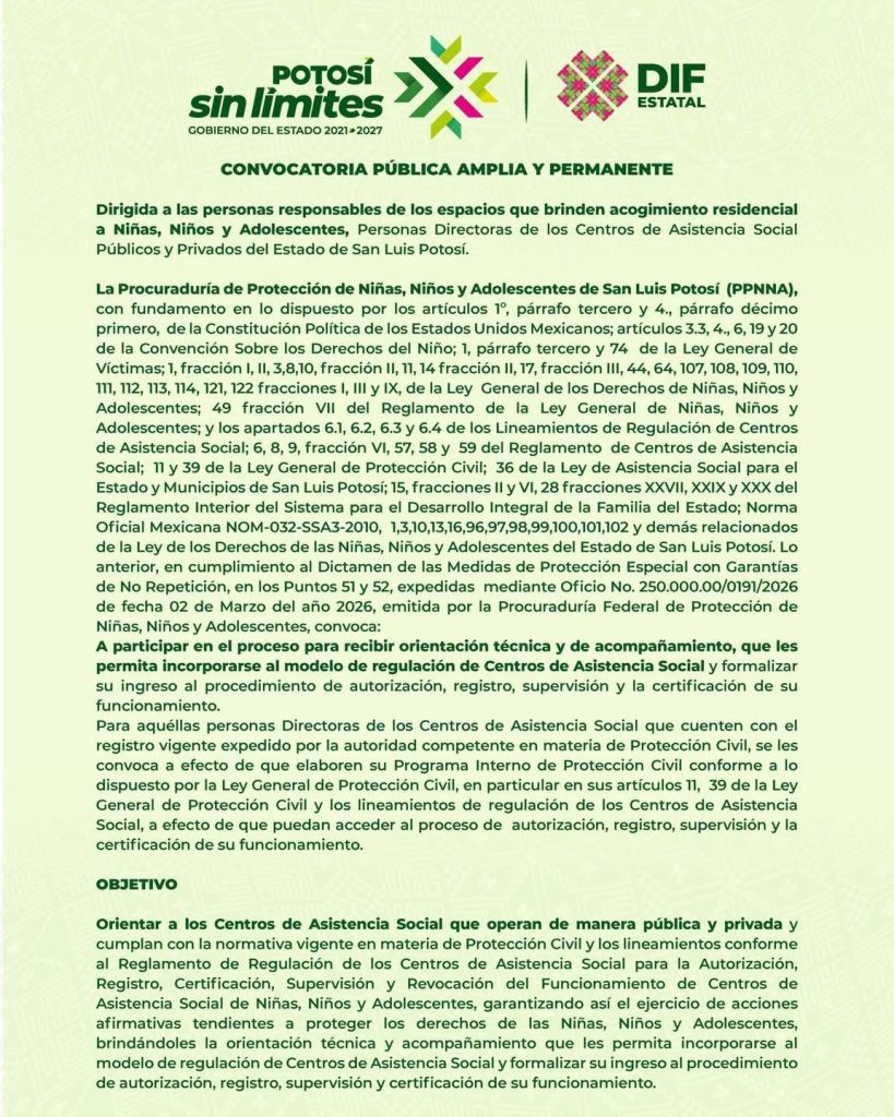 Como parte del compromiso del gobernador Ricardo Gallardo Cardona de fortalecer la protección de niñas, niños y adolescentes, el Sistema Estatal para el Desarrollo Integral de la Familia (DIF), a través de la Procuraduría de Protección de Niñas, Niños y Adolescentes (PPNNA), emitió una convocatoria pública amplia y permanente dirigida a los Centros de Asistencia Social (CAS) públicos y privados, para orientarlos en su proceso de autorización, registro, supervisión y certificación de su funcionamiento.
