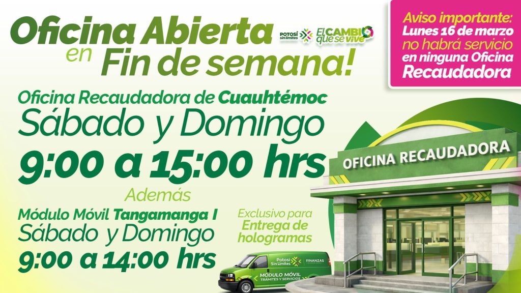 La Secretaría de Finanzas habilita atención en Cuauhtémoc y un módulo para entrega de hologramas en el parque Tangamanga I. El lunes no habrá servicio en las oficinas recaudadoras