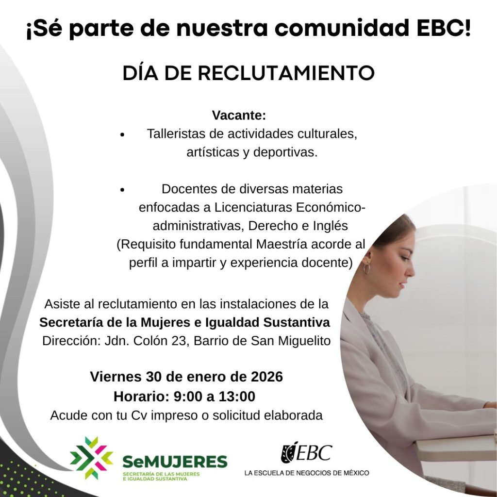 Este viernes 30 de enero, la Secretaría de las Mujeres e Igualdad Sustantiva (Semujeres), en coordinación con la Escuela Bancaria Comercial (EBC), realizará una jornada especial de reclutamiento dirigida a mujeres potosinas. El evento se realizará de 9:00 a 13:00 horas en el patio central de la dependencia, ubicado en Jardín Colón número 23, en el barrio de San Miguelito.