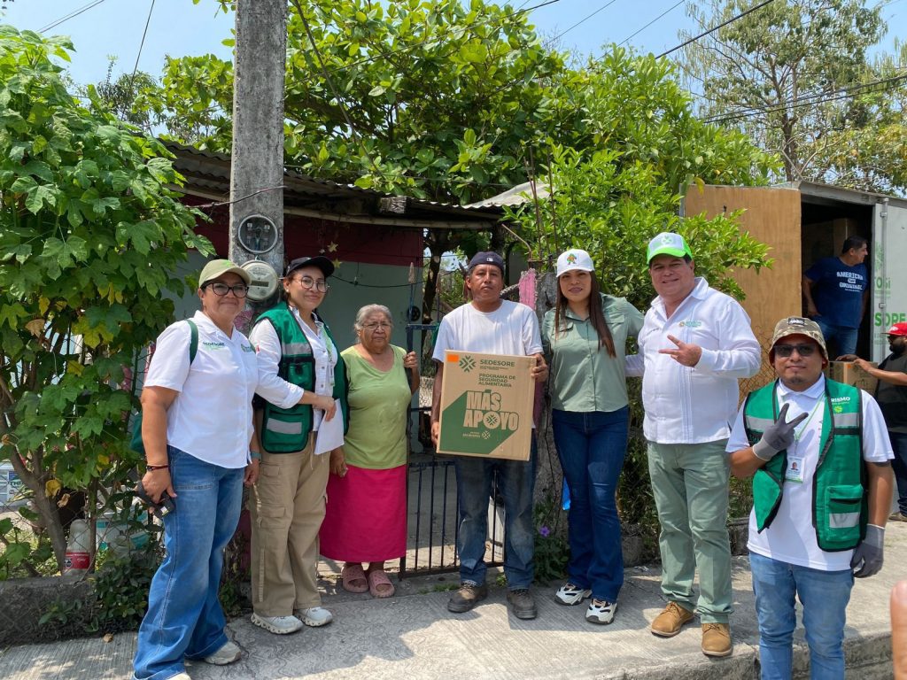 Durante cada visita, brigadas verifican la documentación correspondiente para garantizar una distribución ordenada y directa. Los paquetes incluyen alimentos de la canasta básica y artículos de limpieza, apoyo que consolida el cambio que se vive y se siente al llevar ayuda directa hasta los hogares que más la necesitan en la región Huasteca.