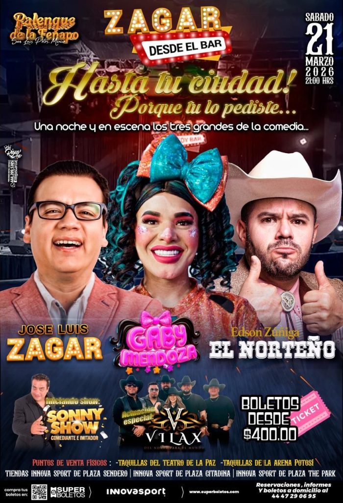 Siguiendo la instrucción del gobernador del estado, Ricardo Gallardo Cardona, de fortalecer la oferta de entretenimiento para las familias potosinas, el Patronato de la Feria Nacional Potosina (Fenapo) presentará el sábado 21 de marzo a las 21:00 horas una gran velada de comedia en el Palenque, encabezada por José Luis Zagar con su espectáculo “Desde el Bar… Hasta tu ciudad, porque tú lo pediste”, acompañado por Gaby Mendoza y Edson Zúñiga “El Norteño”, quienes prometen una noche llena de humor y cercanía con el público.