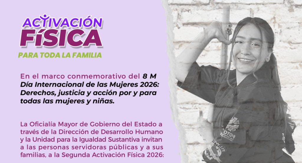 Como parte de las acciones que impulsa el gobernador del estado Ricardo Gallardo Cardona para promover el bienestar sin límites de las mujeres potosinas, la Oficialía Mayor (OM), a través de la Unidad de Igualdad Sustantiva, llevará a cabo la Segunda Activación Física 2026: Taller Práctico de Defensa Personal.