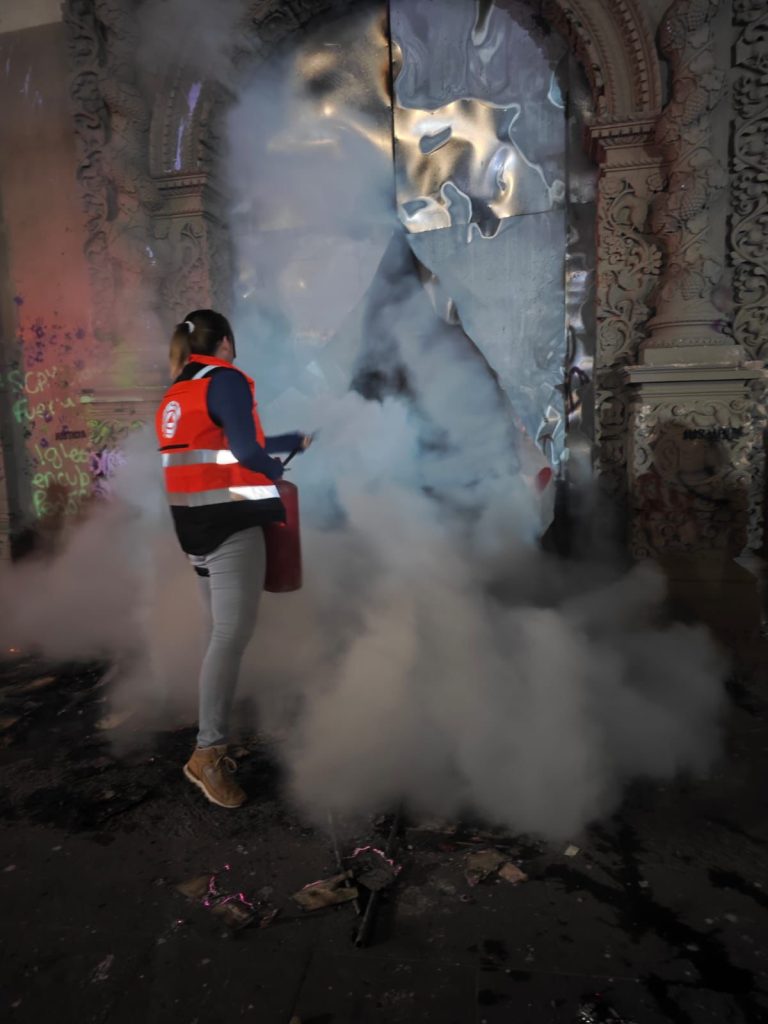 Al concluir la marcha, las integrantes de Protección Civil actuaron de manera coordinada con el H. Cuerpo de Bomberos para controlar un incendio registrado en inmuebles de la Universidad Autónoma de San Luis Potosí (UASLP) y en la Iglesia de La Compañía. Durante la movilización, que reunió a cerca de 10 mil personas, se respetó la libre expresión y se mantuvo vigilancia preventiva para atender cualquier emergencia médica, consolidando un trabajo institucional sin límites en materia de protección y atención ciudadana.