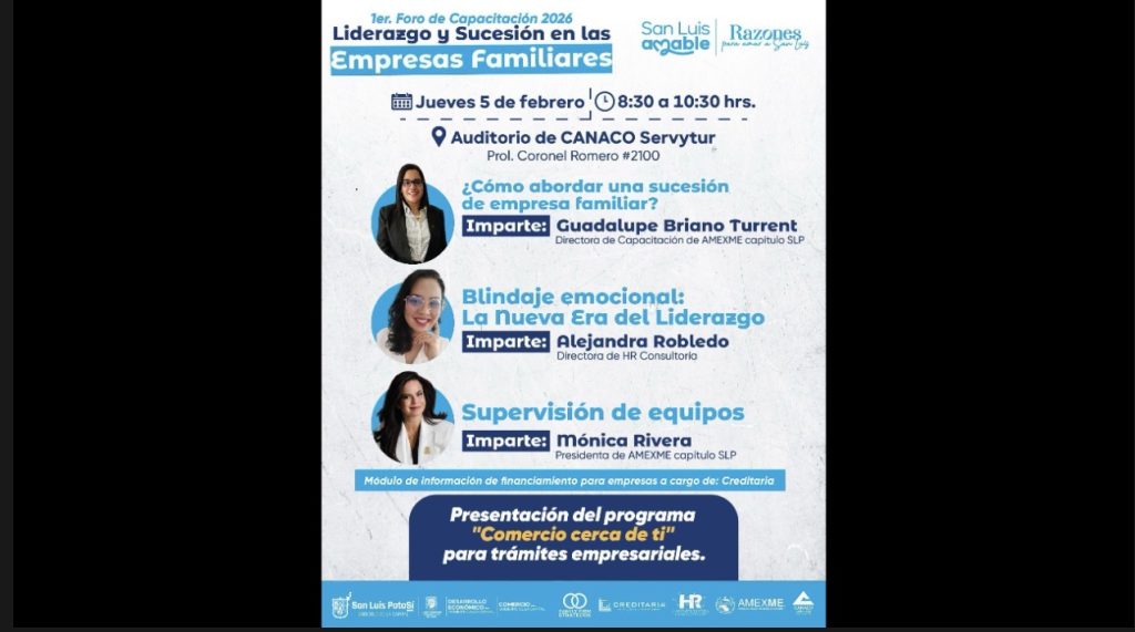 Con el objetivo de fortalecer la permanencia, competitividad y crecimiento de las empresas familiares, el Gobierno de la Capital, a través de la Dirección de Desarrollo Económico, realizará el 1er Foro de Capacitación 2026 “Liderazgo y Sucesión en las Empresas Familiares”, un espacio de formación dirigido a empresarias, empresarios y emprendedores potosinos.