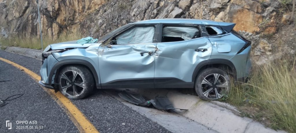 Al llegar al entronque con la lateral que conduce a la caseta de cobro, el conductor perdió el control del vehículo, saliéndose de la carpeta asfáltica y chocando de frente contra el cerro.