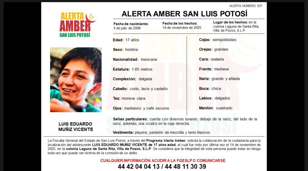 La Fiscalía General del Estado de San Luis Potosí (FGESLP) activó una ficha de Alerta Amber para la localización de Luis Eduardo Muñiz Vicente, quien tuvo contacto por última vez con sus familiares el 14 de noviembre de 2025, en la comunidad Laguna de Santa Rita de Villa de Pozos.