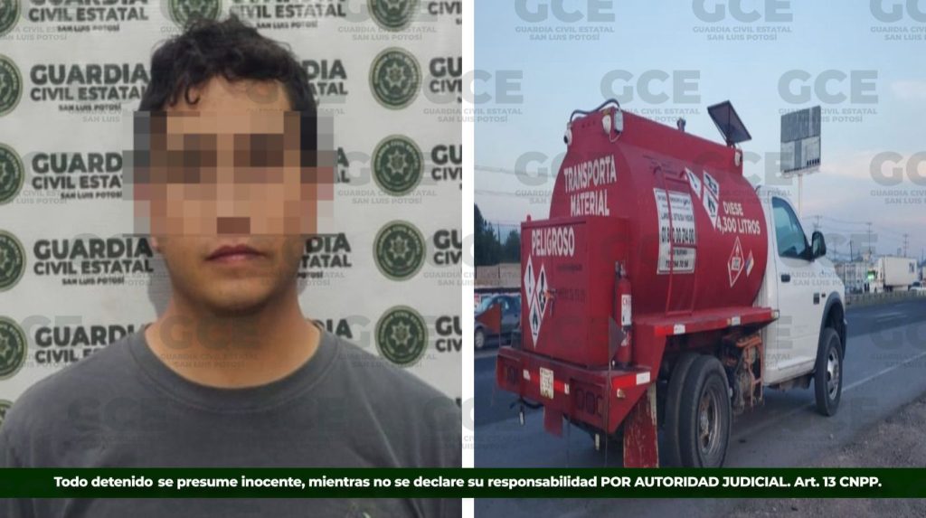 Durante los recorridos de seguridad que son realizados por agentes de la Guardia Civil Estatal, adscritos a la División Caminos, se efectuó la detención de Alberto “N” de 29 años, quien se desplazaba a bordo de un vehículo marca Dodge, tipo RAM, modelo 2014, en el que trasladaba 3 mil litros de diésel, mismo del que no pudo comprobar su procedencia legal.