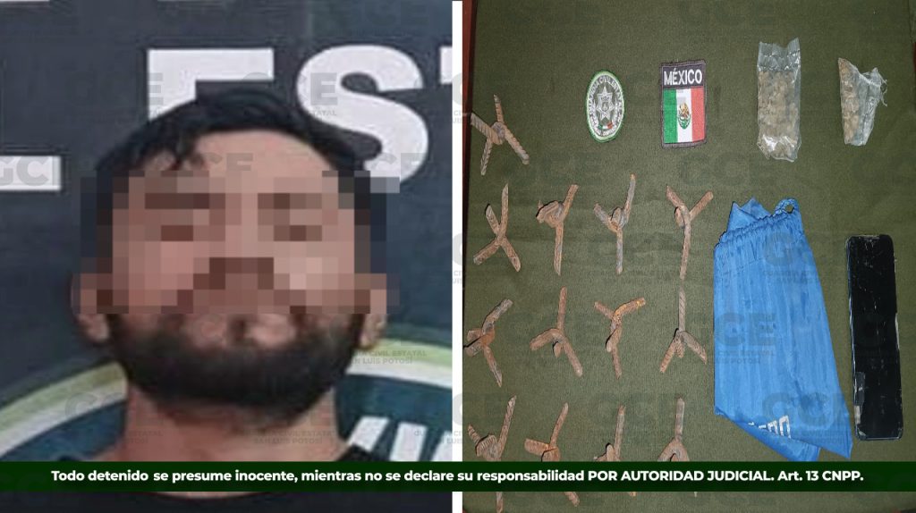 Elementos de la Guardia Civil Estatal (G.C.E.) llevaron a cabo la detención de un masculino señalado por su probable responsabilidad en los delitos de portación de armas prohibidas, obstrucción de la seguridad pública y posesión de droga.
