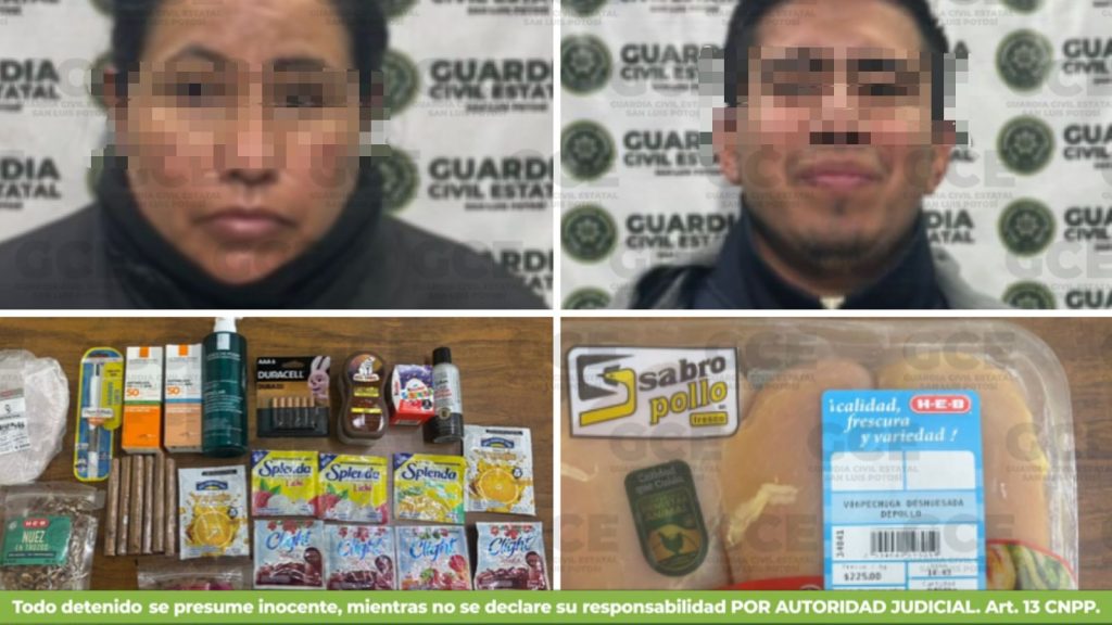 San Luis Potosí, S.L.P.- Agentes de la Guardia Civil Estatal, detuvieron a una mujer y un hombre, señalados de intentar sustraer sin pagar mercancía diversa de una tienda de conveniencia.
