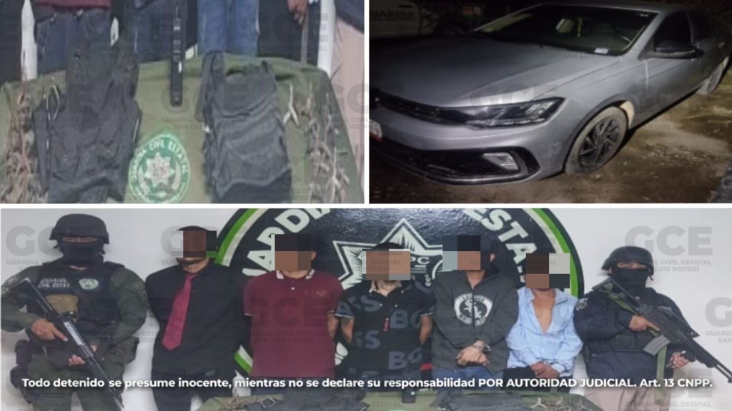 Agentes de la Guardia Civil Estatal reportaron la detención de cinco personas, en la colonia Los Pinos, en el municipio de Matehuala, vinculados a diversas actividades ilegales, logrando decomisarles equipo táctico, así como una radio frecuencia y un vehículo robado.