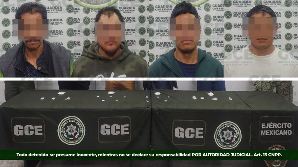Los detenidos fueron identificados como: Héctor “N”, de 41 años, Sergio “N”, de 33 años, Antelmo”N”, de 28 años y Humberto “N” de 54 años. Durante la intervención, los agentes estatales aseguraron 20 bolsas con sustancia conocida como “cristal”, asimismo, 40 bolsas de plástico vacías, las cuales presuntamente estaban destinadas a la dosificación de diversos estupefacientes.
