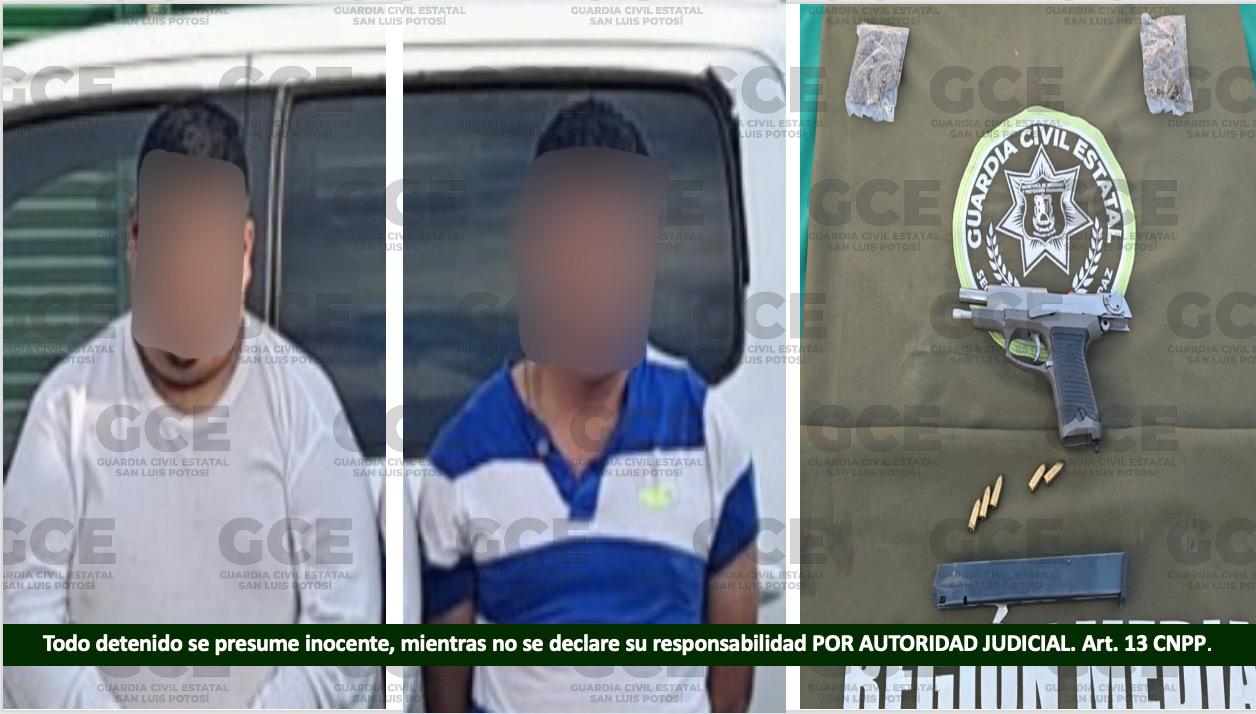 Detiene a dos hombres en Rioverde con arma de fuego abastecida y con dosis de droga
