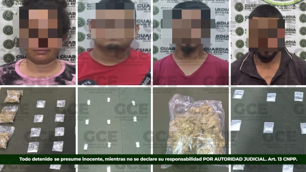 En otro hecho, en Ciudad Valles, elementos estatales detuvieron a John “N”, de 30 años; José “N”, de 38 años; y Karla “N”, de 33 años, quienes presuntamente estarían relacionados con la distribución de droga, asegurándoles dosis de cristal, “piedra”, marihuana y dinero en efectivo. De manera adicional, en el municipio de Ahualulco, fue detenido Brian “N”, de 31 años, en posesión de diversas dosis de “cristal”.