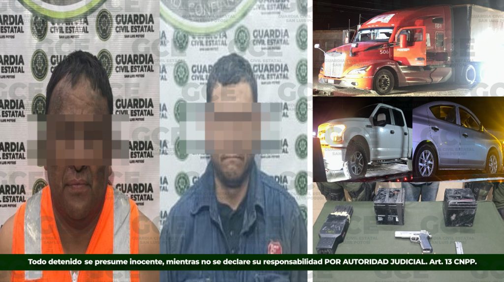 Agentes de la Guardia Civil Estatal detuvieron a Arturo “N” de 45 años y a Fernando “N” de 42 años, ambos con antecedentes por el delito de tráfico de personas, quienes fueron asegurados con dos tractocamiones con reporte de robo en la carretera federal 57 a México, a la altura de la comunidad El Cerrito, en el municipio de Santa María del Río.