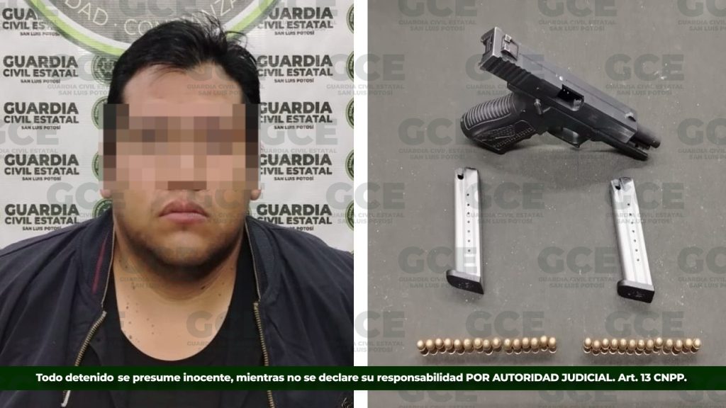Agentes de la Guardia Civil Estatal, detuvieron a un presunto, por el probable delito de portación de un arma de fuego, durante sus labores en la carretera Libramiento Oriente – San Luis Potosí, luego de que fuera detectado un masculino, deambulando cerca de los vehículos de carga, estacionados en el sector.