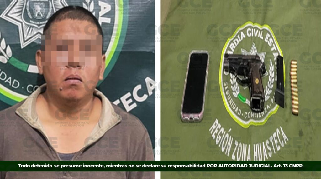 Los hechos se suscitaron en la cabecera municipal de Tampacán, donde Ángel “N” de 37 años, resultó detenido, luego de que agentes estatales lo detectaran sobre la calle 16 de Septiembre. Tras el señalamiento de la parte afectada, al presunto se le informó que sería detenido por el probable delito de robo. Al momento de su arresto se le aseguró un celular y un arma de fuego tipo escuadra.