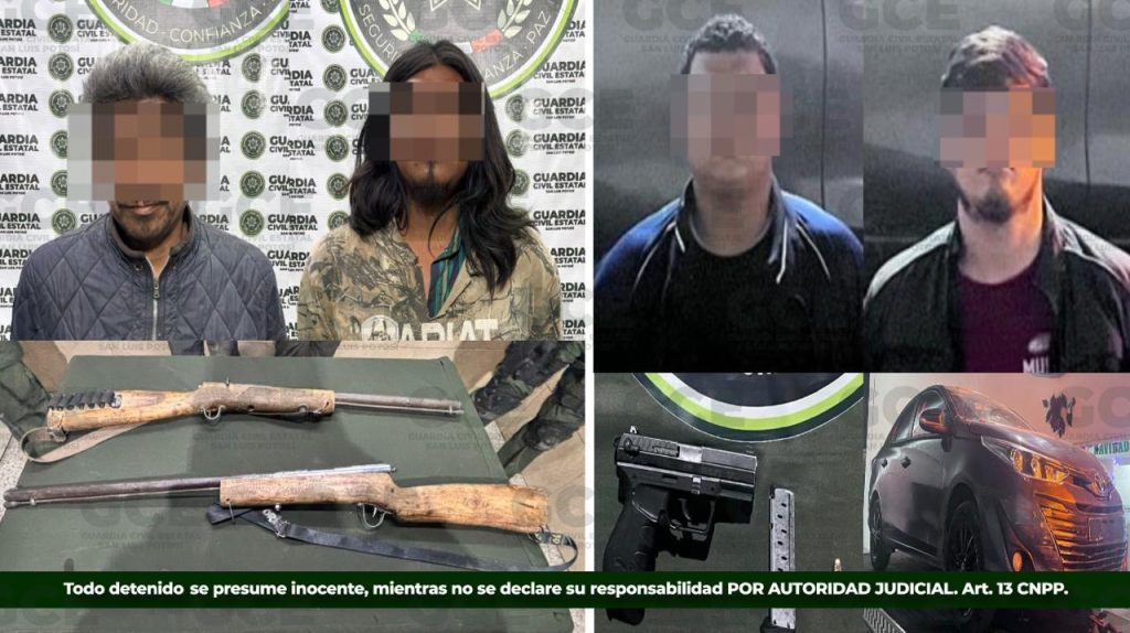 Policías de la Guardia Civil Estatal, informaron que, durante los operativos de seguridad desplegados en los municipios de Villa de Zaragoza y en Tanquián de Escobedo, resultó en la detención de cuatro personas, por el probable delito de portación de armas de fuego.