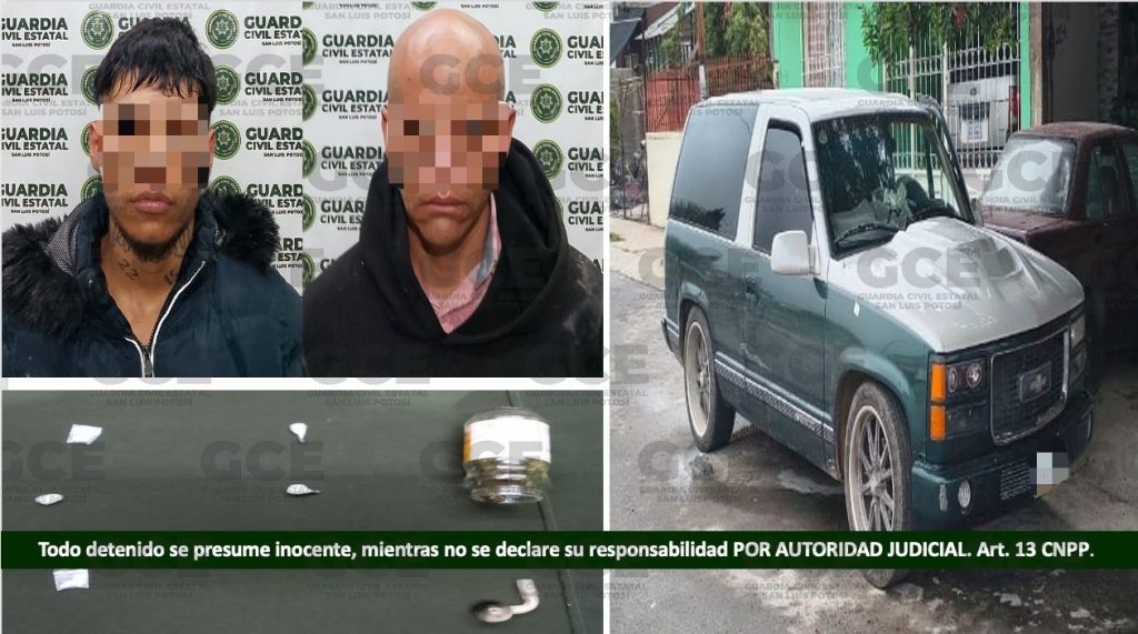 Los presuntos, identificados como Ricardo “N” de 21 años y Luis “N” de 43 años, quienes cuentan con antecedentes criminales, además de una adolescente de 16 años, fueron detenidos a bordo de un vehículo Chevrolet línea Blazer, modelo 1998, que tenía reporte de robo en el municipio de Santa María del Río. Al momento de su arresto en Ciudad Satélite, se les aseguró un frasco con marihuana y seis dosis de metanfetaminas.