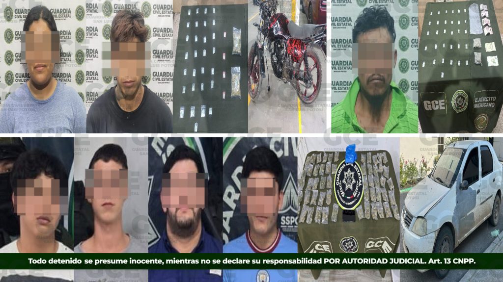 Por último, en el municipio de San Vicente Tancuayalab, agentes de la GCE detuvieron a Ricardo “N” de 19 años, Yhan “N” de 20 años, Hugo “N” de 27 años y Emiliano “N” de 23 años, luego de que se les aseguraran 54 dosis de marihuana y un vehículo en el que viajaban.