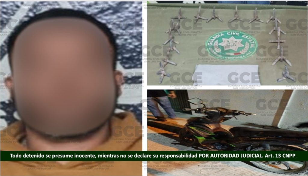 Derivado de los trabajos preventivos, realizados en el municipio de Matehuala, un hombre resultó detenido, tras asegurarle objetos prohibidos, conocidos como “poncha llantas”, además de una motocicleta en la que se desplazaba.