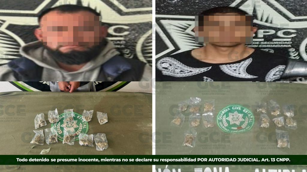 Uno de los hechos ocurrió en la comunidad Vallejo, perteneciente al municipio de Matehuala, sitio donde Edgar “N” de 41 años fue detenido con 10 bolsas que contenían marihuana, por ello fue puesto a disposición de las autoridades competentes. De igual manera, en este mismo municipio, se detuvo a Ángel “N” de 29 años, tras asegurarle 14 bolsas con marihuana.