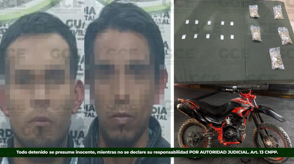 A los presuntos se les aseguró cinco bolsas de marihuana,10 dosis de la droga conocida como “cristal” y una motocicleta marca Italika, color rojo con negro.