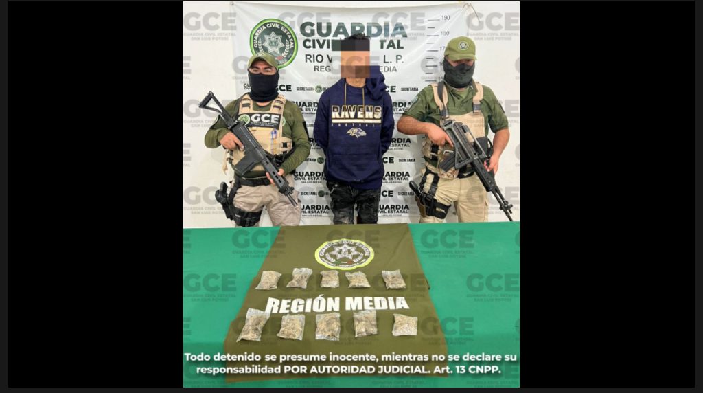 Despliegues realizados por la Guardia Civil Estatal y su mando regional de la Zona Media Oscar Hernández, permitieron que en la colonia Quintas Las Huertas, en el municipio de Ríoverde, elementos de la Unidad de Violencia de Género, detuvieran a Kevin “N” de 26 años, quien llevaba consigo 10 bolsas con apariencia de marihuana y una camioneta en la cual se desplazaba.