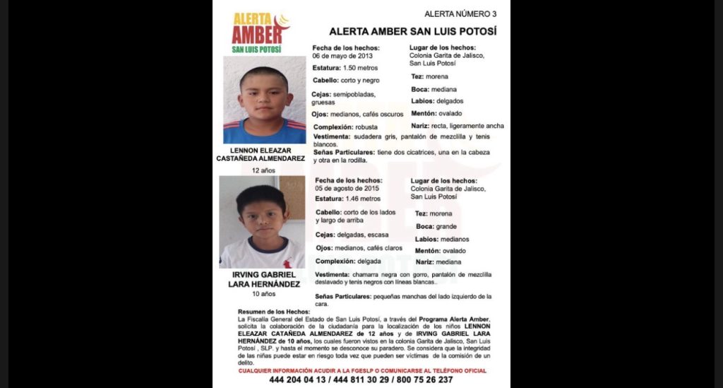 San Luis Potosí, SLP.-La Fiscalía General del Estado de San Luis Potosí (FGESLP) activó la Alerta Amber para localizar a Lennon Eleazar Castañeda Almendarez, de 12 años, e Irving Gabriel Lara Hernández, de 10 años, quienes desaparecieron en la colonia Garita de Jalisco en la capital potosina.