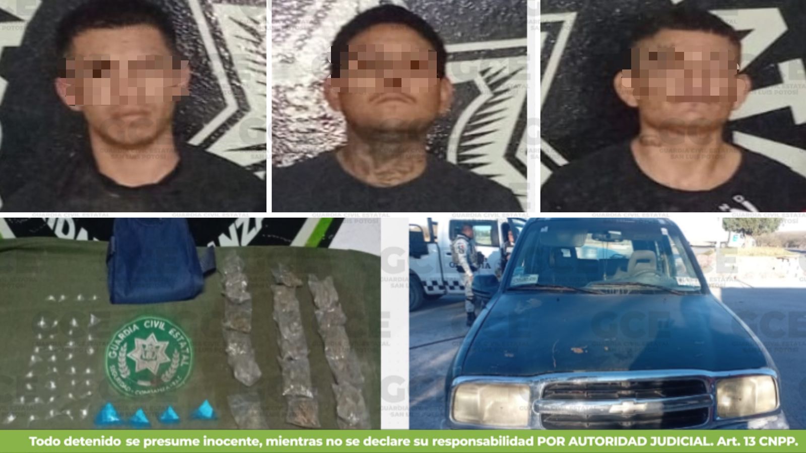 Detienen a tres presuntos integrantes de grupo delictivo con droga en la carretera a Matehuala