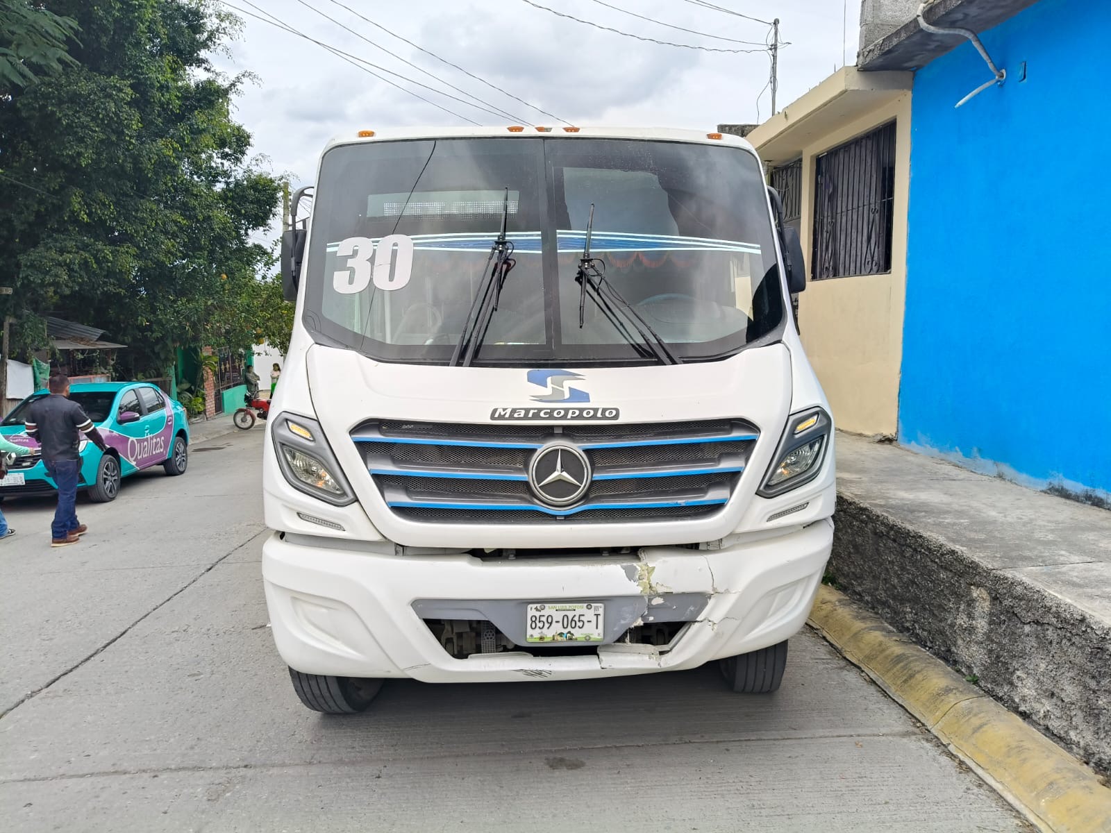 Fuerte choque entre autobús y camioneta deja solo daños materiales