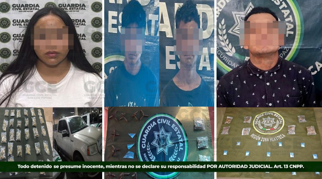En la región Huasteca, en El Naranjo, la GCE detuvo a Iván Alejandro “N”, de 25 años, y Jesús “N”, de 21 años, considerados objetivos prioritarios, a quienes se les aseguraron artefactos “ponchallantas” y dosis de marihuana y “cristal”, mientras que, en Coxcatlán, detuvo a Osiel “N”, de 35 años, a quien se le aseguraron dosis de “cristal”, bolsas de marihuana y una motocicleta.
