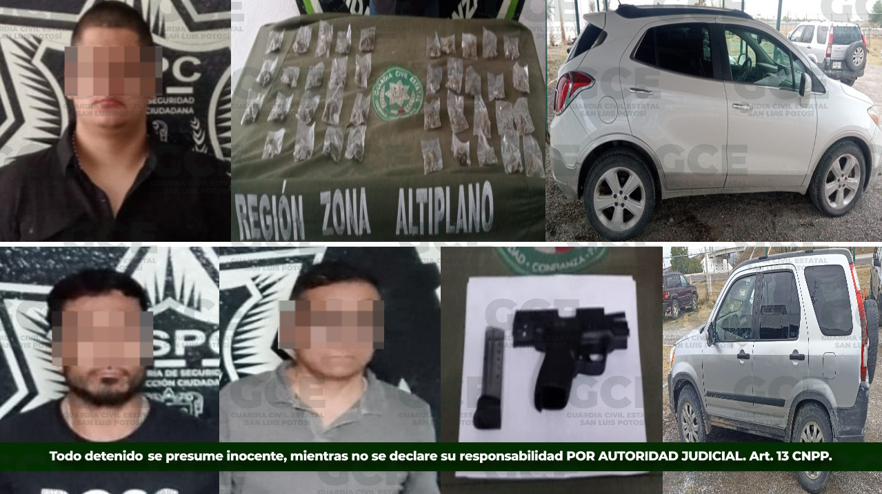 En Matehuala y la capital, la GCE detuvo a presuntos objetivos prioritarios y se aseguraron droga, un arma de fuego y vehículos.