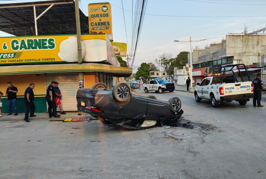 Durante la trayectoria, el vehículo impactó un macetero y una estructura metálica perteneciente a locales comerciales, para finalmente volcar y quedar con las llantas hacia arriba.