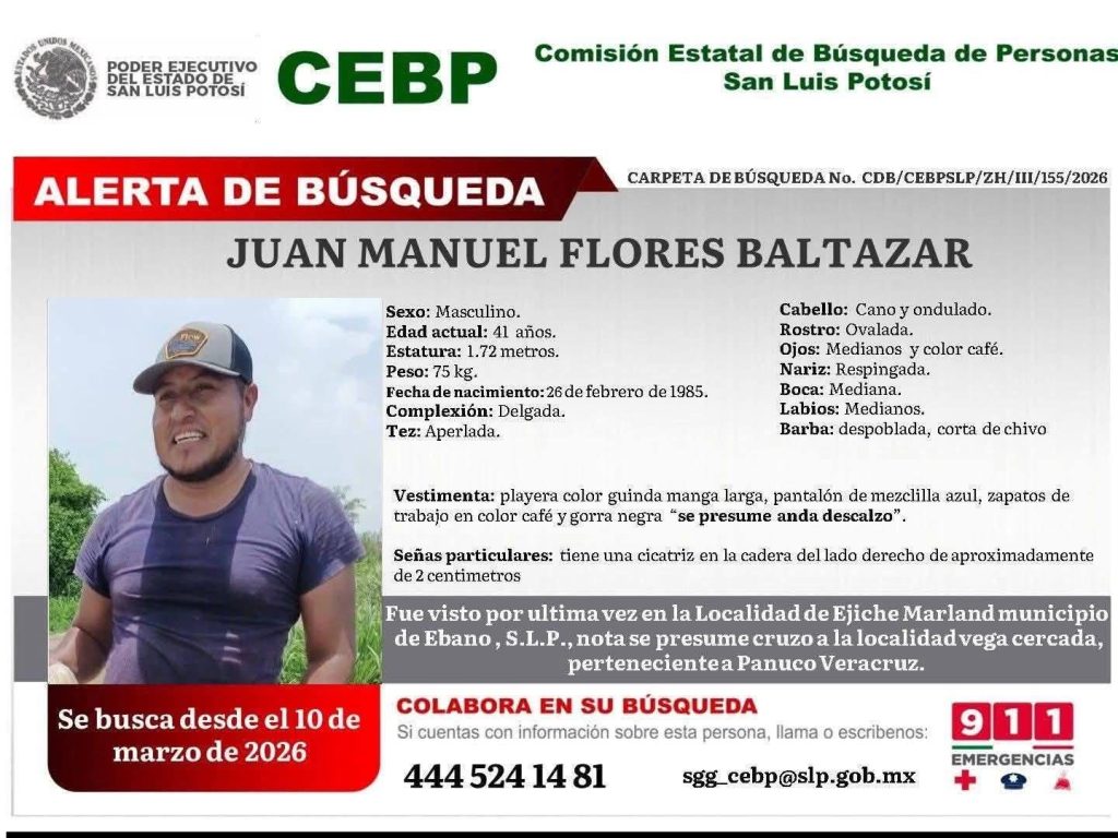 Personal de la Comisión Estatal de Búsqueda de Personas, con el apoyo de familiares y ciudadanos voluntarios, lleva a cabo diversas acciones para tratar de localizar a Juan Manuel Flores Baltazar, quien fue reportado como no localizado desde el pasado 10 de marzo.