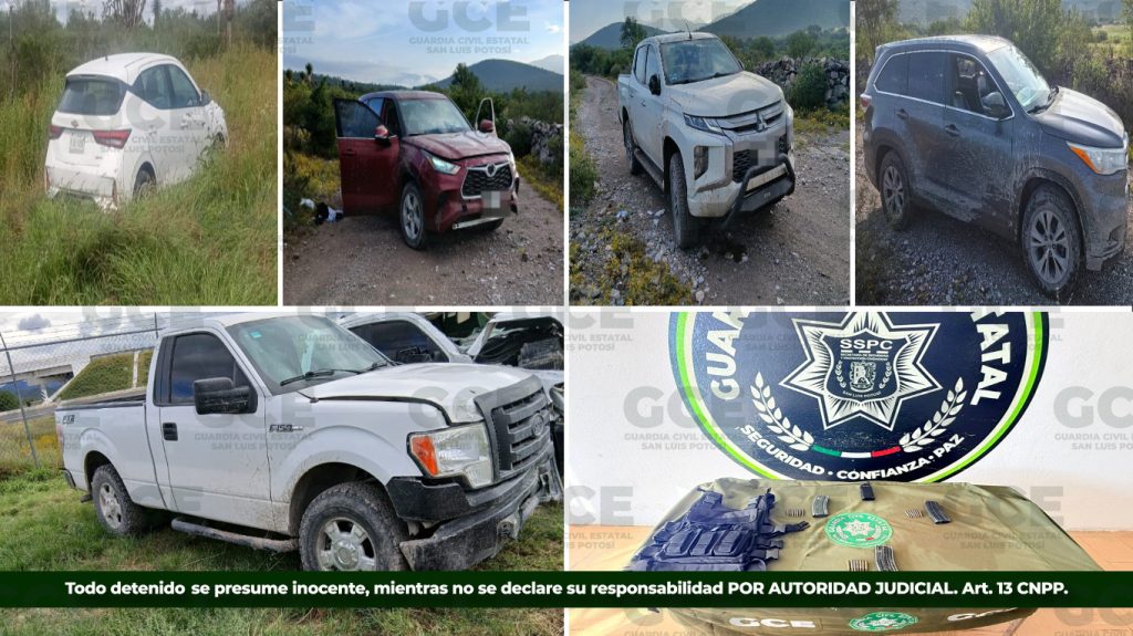 En un dispositivo de seguridad, efectuado por agentes de la Guardia Civil Estatal, en el municipio de Matehuala, se recuperaron cinco vehículos con reporte de robo, además de asegurarse equipo táctico de delincuentes.