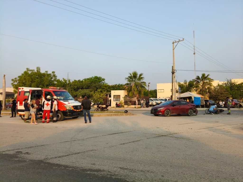 Tras el choque, el motociclista cayó sobre el automóvil y se golpeó el rostro contra el medallón, sufriendo lesiones superficiales. Paramédicos de la Cruz Roja acudieron al lugar para brindarle atención y se informó que sería trasladado a una clínica para una valoración médica.
