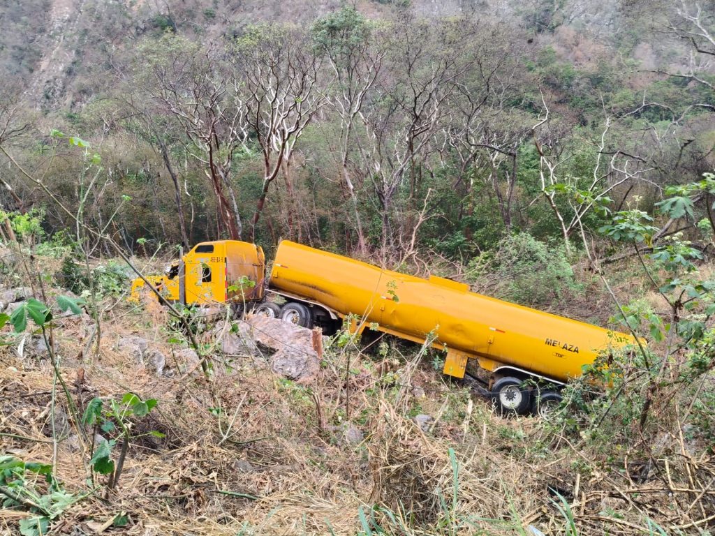 Una pipa de color amarillo fue localizada volcada en el fondo de un barranco la mañana de este lunes, luego de sufrir un accidente sobre la carretera estatal Valles–El Naranjo, a la altura del kilómetro 15.