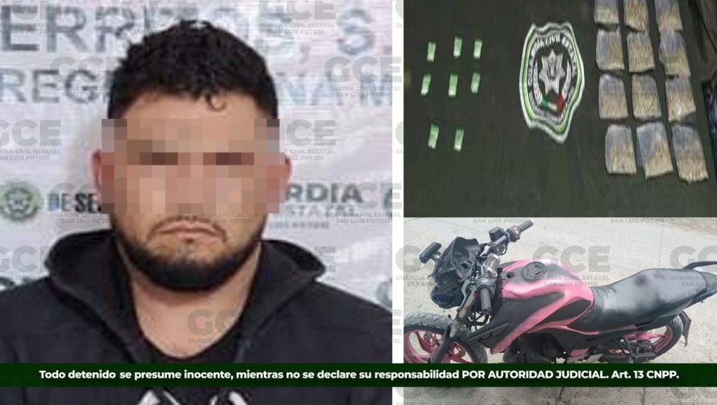 De manera adicional, durante la intervención se le localizaron diversas dosis de presunta droga, consistentes en: ocho dosis de “cristal”, 12 dosis de marihuana y una motocicleta.