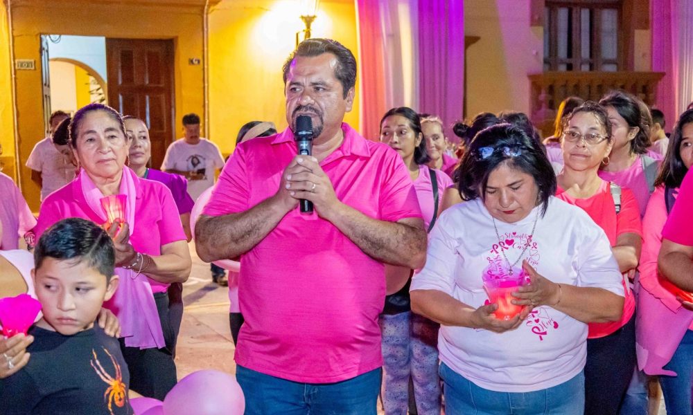 Asistentes se unieron para crear un moño humano en honor a sobrevivientes y víctimas del cáncer de mama