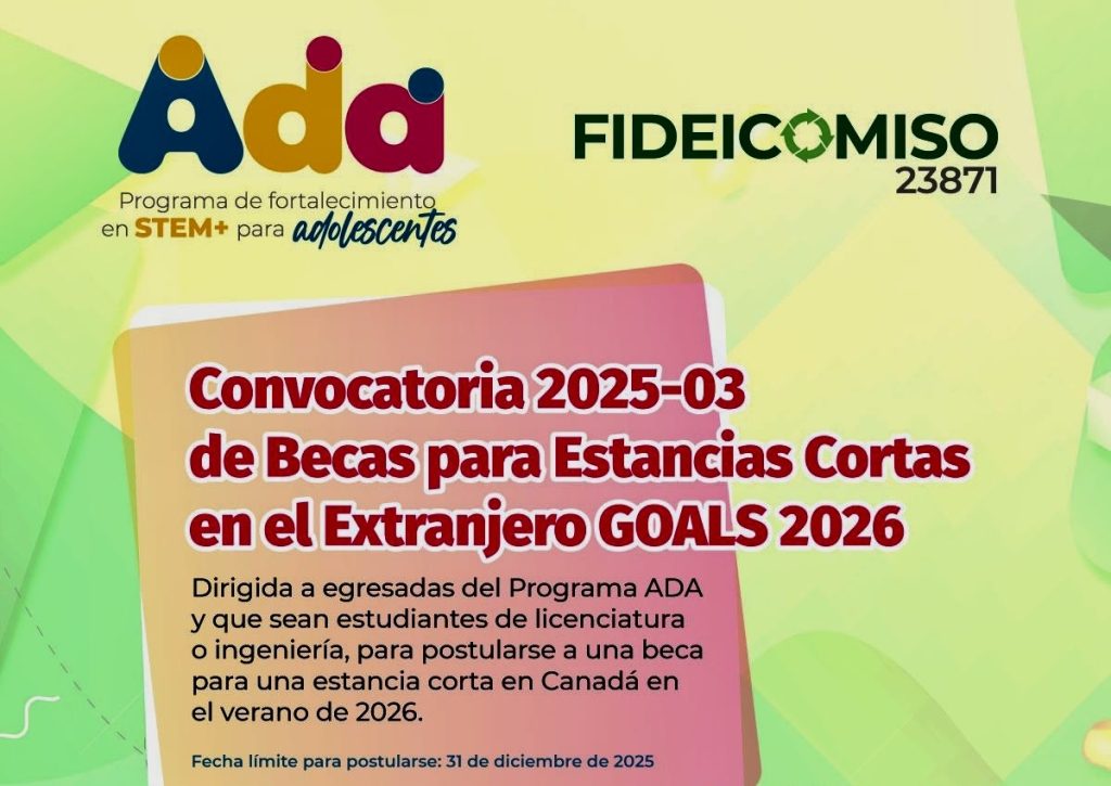 El Consejo Potosino de Ciencia y Tecnología (Copocyt) invita a mujeres estudiantes de licenciatura o ingeniería, egresadas del programa ADA, a participar en la Convocatoria 2025-03 de becas “Go Abroad: Learning for Sustainability (GOALS) 2026”, que permitirá cursar una estancia corta en la Universidad de Waterloo, Canadá, durante el verano del próximo año. El programa fomenta el aprendizaje basado en proyectos, el pensamiento crítico, la resolución creativa de problemas y la comunicación colaborativa, todo enfocado en los Objetivos de Desarrollo Sostenible y la mejora del dominio del inglés.
